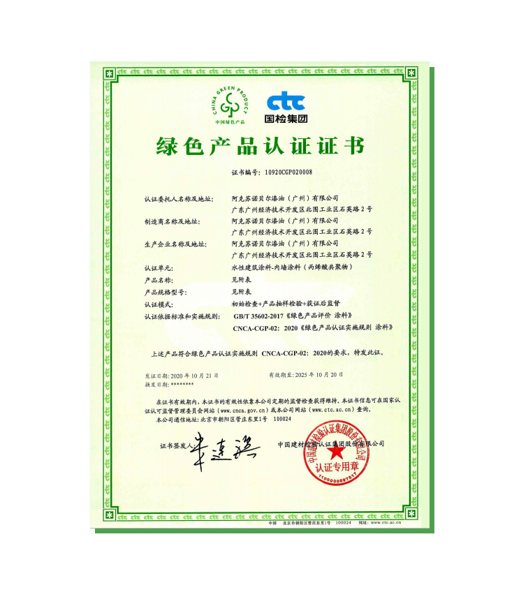 依据GB/T 35602-2017《绿色产品评价 涂料》以及CNCA-CGP-02:2020《绿色产品认证实施规则 涂料》,多乐士森呼吸、劲护、金装、至尊、致悦等产品线获得国检集团“中国绿色产品”认证。