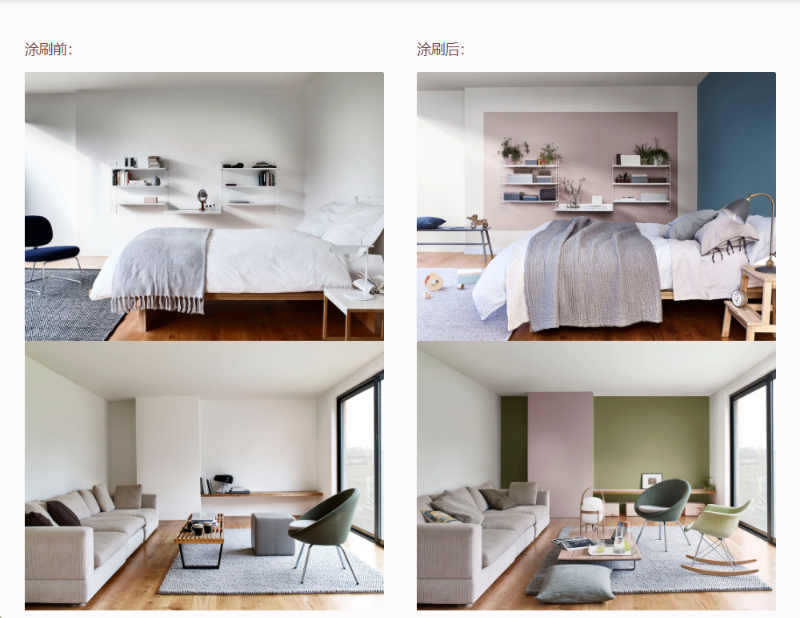 ※涂刷面积、涂刷环境、采光条件以及所用材料的不同均可能造成实际涂料颜色效果与本手册所示颜色效果的视觉差异,色号确认请以多乐士色卡为准。