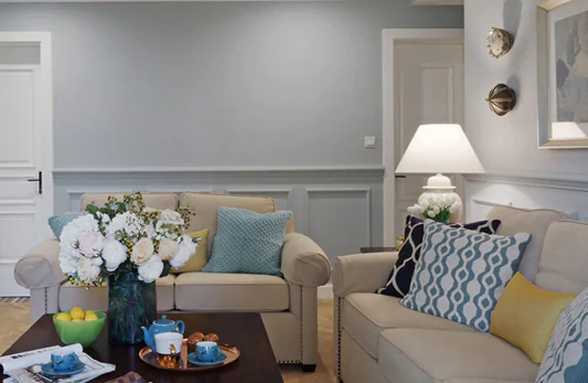 烟蓝色淡雅而柔和,在搭配浅色家具时,可以组合一些同色系配饰,如台灯、装饰面等等,让色彩的层次更分明。