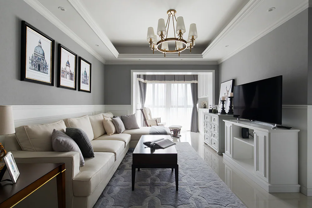 浅滩银珠带着海滩般的沉稳与优雅,在整墙的应用时,搭配美式风格的家具,深色木质感与墙面的通透色彩营造出一种沉着稳重的大气感,并且不需要过多修饰。
