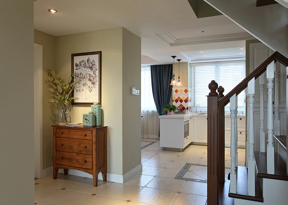 卵石灰是一款带着暖意的中性色,搭配原木色家具和花砖打造出一个写意的美式空间。