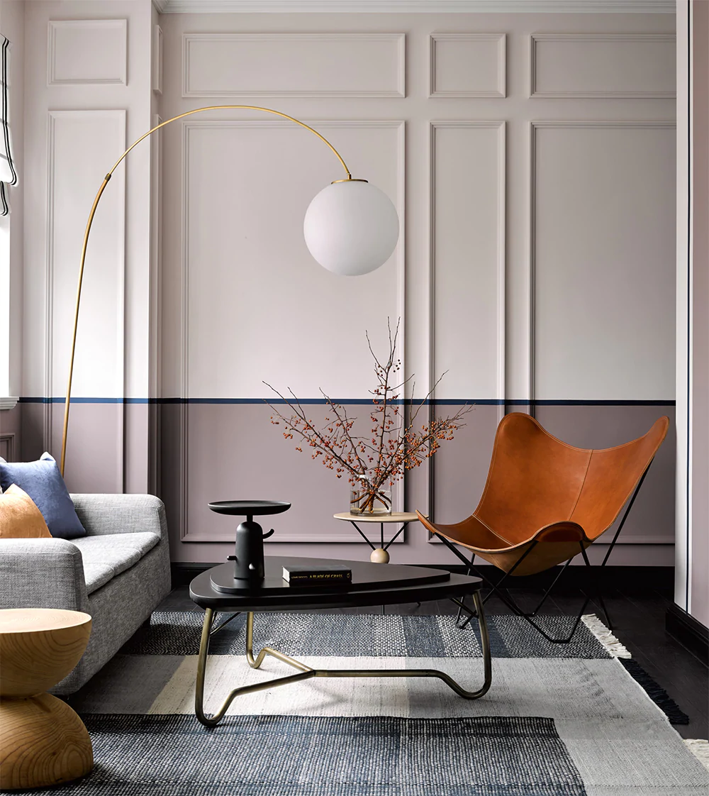 烟紫色的优雅运用于墙面上,将恬静延续到空间的每一个角落,搭配白色的家具与配饰,更增法式气息。