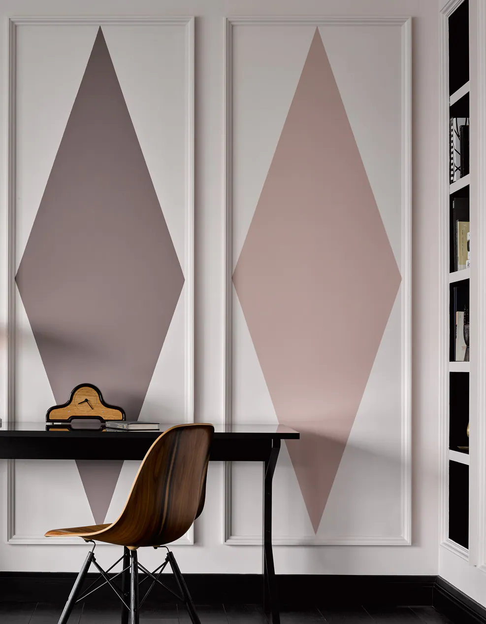 皮粉色、暖棕色、搭配同色系列的粉色,一起勾画出一个极富创意的书房空间,以同色系递进的方式在石膏线内勾画出几个菱形,细节之处展现生活的别致与写意。