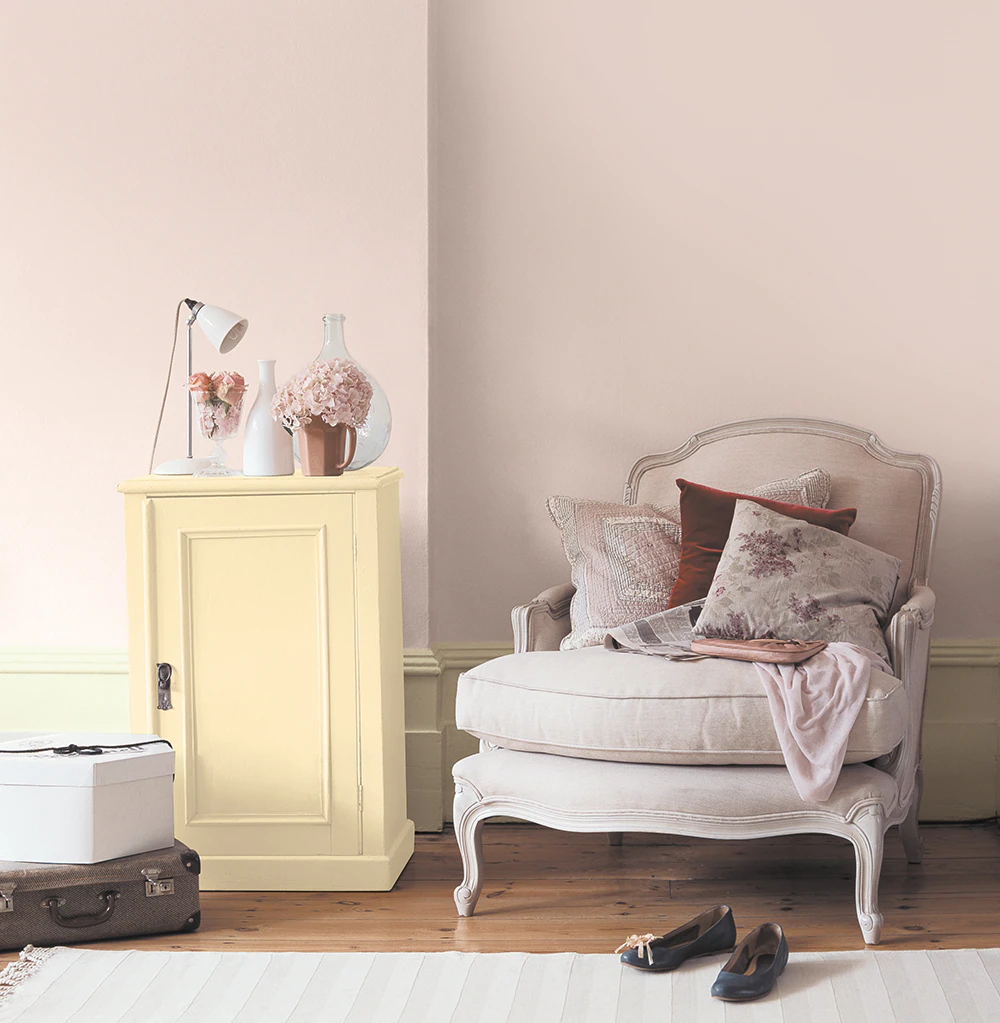 柔和的皮粉色很适合营造一种浪漫的氛围,搭配法式宫廷风的浅色家具,以及浅色印花的软包与靠垫,带着梦幻的生活气息,恬静却不会觉得过于甜腻。